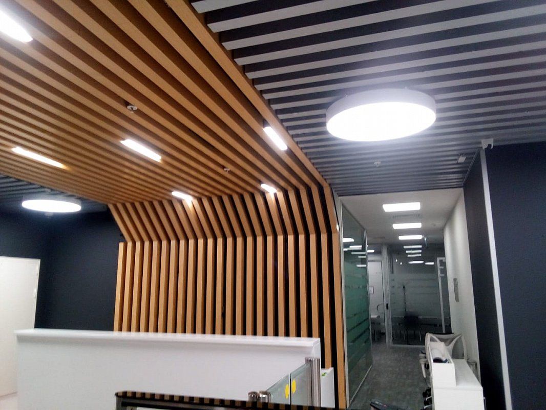 Кубообразные потолки состоят из алюминиевых реек прямоугольного сечения, установленных с равномерным шагом. Конструкция позволяет эффективно скрывать инженерные коммуникации, при этом сохраняя доступ к ним для обслуживания. Кубообразная рейка отлично сочетается с линейным и точечным освещением, а также с вентиляционными системами.
