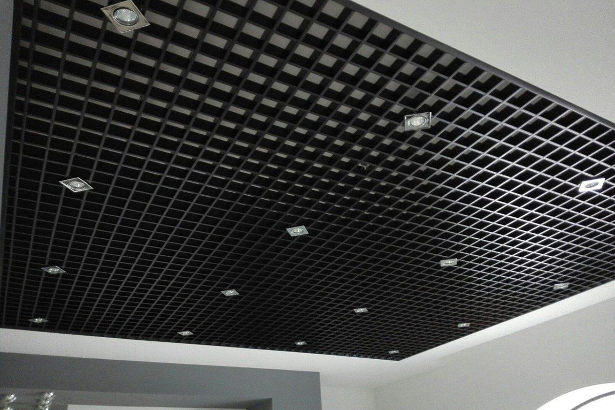 Ячеистая структура делает потолок менее массивным и визуально увеличивает пространство.